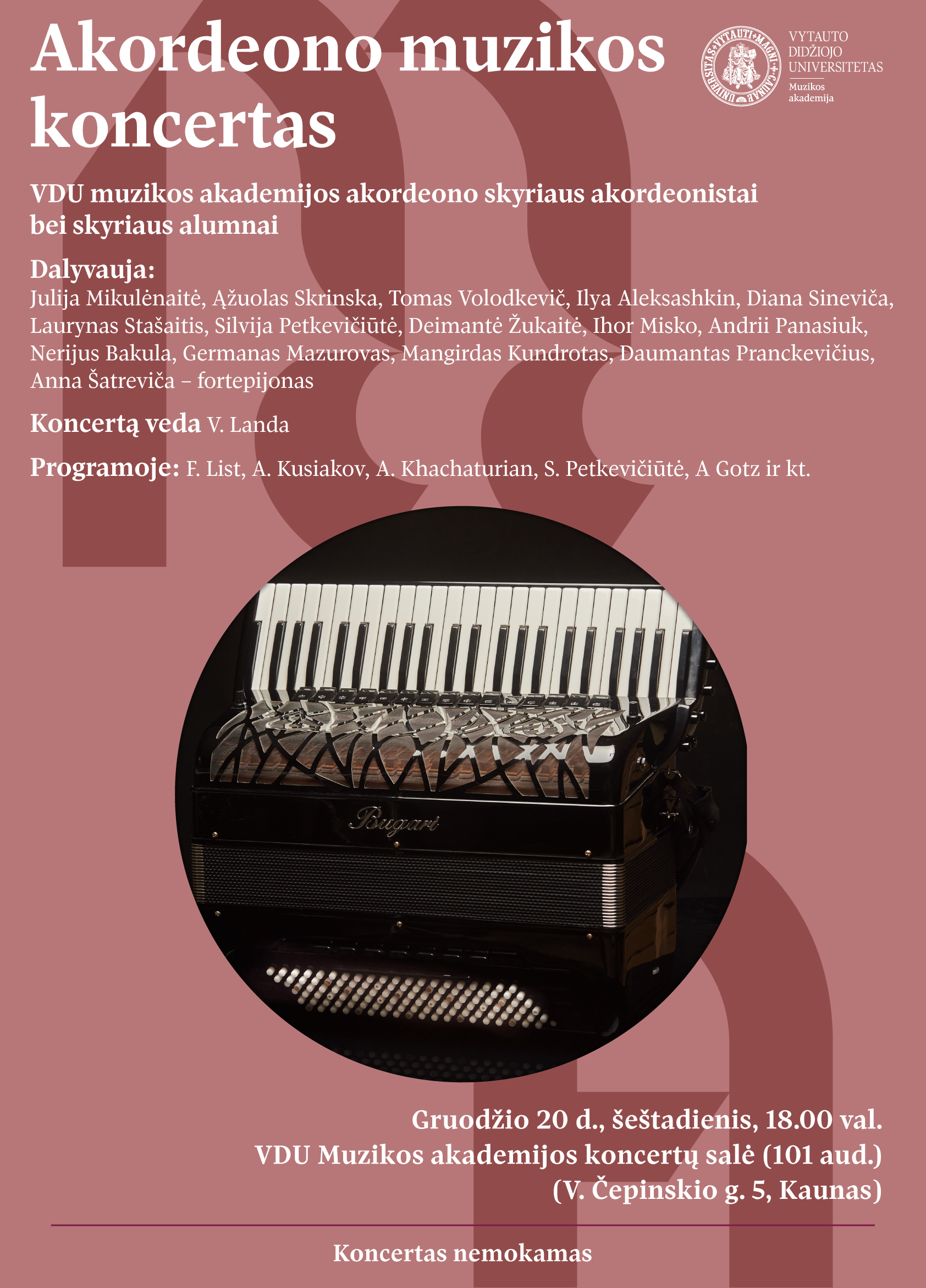 2025 m. gruodžio 15 d. VDU Muzikos akademijos koncertų salėje vyko kasmetinis VDU MA Akompanimento klasės koncertas–maratonas. Tikra muzikinė šventė, subūrusi gausų atlikėjų, dėstytojų ir klausytojų ratą.