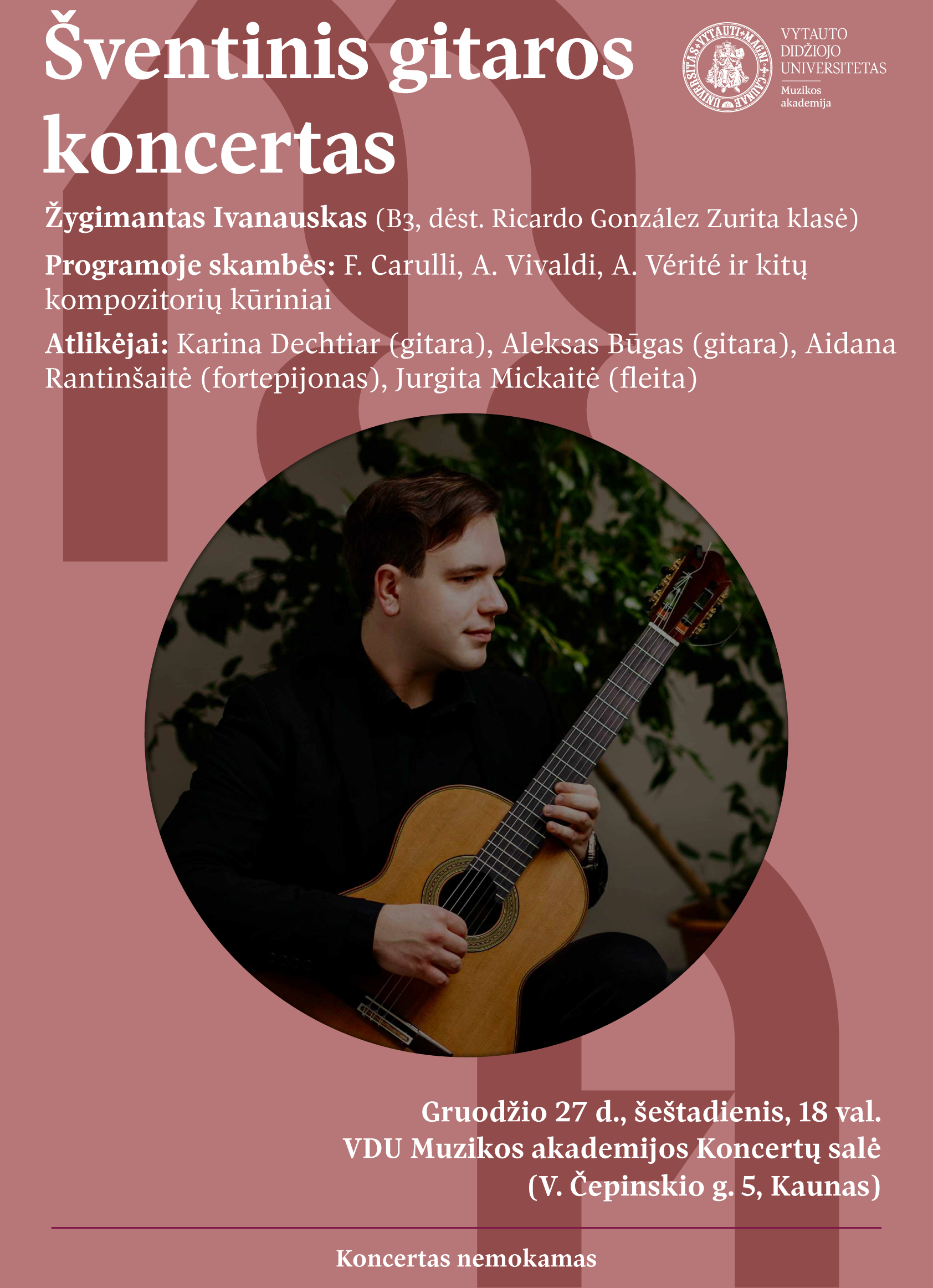 Kviečiame į Šventinį gitaros koncertą, atlikėjas Žygimantas Ivanauskas (B3 k. studentas, dėst. R. Gonzalez Zurita klasė) gruodžio 27 d. Muzikos akademijos Koncertų salėje