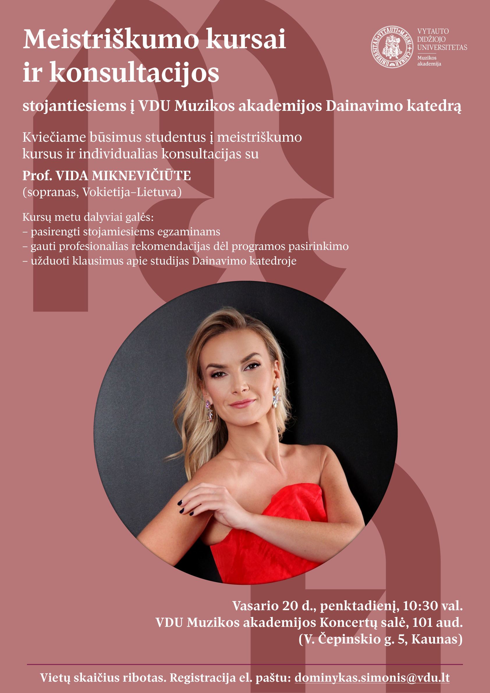 Kviečiame būsimus studentus į meistriškumo kursus ir individualias konsultacijas su prof. Vida Miknevičiūte (sopranas, Vokietija-Lietuva) vasario 20 d. 10:30 val. MA Koncertų salėje