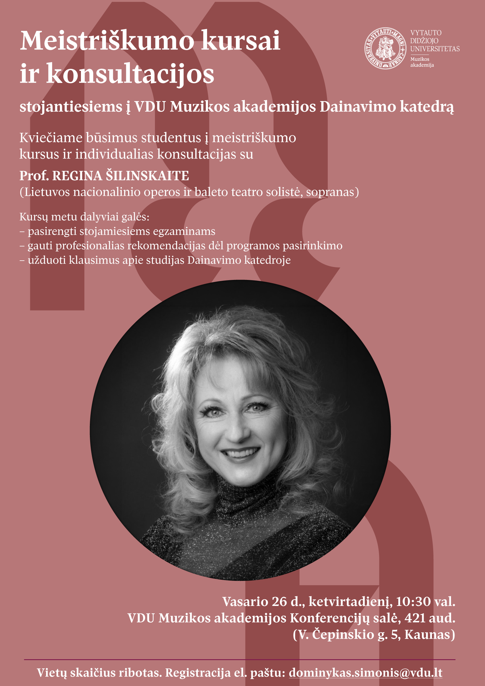 Kviečiame būsimus studentus į meistriškumo kursus ir individualias konsultacijas su prof. Regina Šilinskaite (sopranas) vasario 26 d. 10:30 val. MA Konferencijų salėje