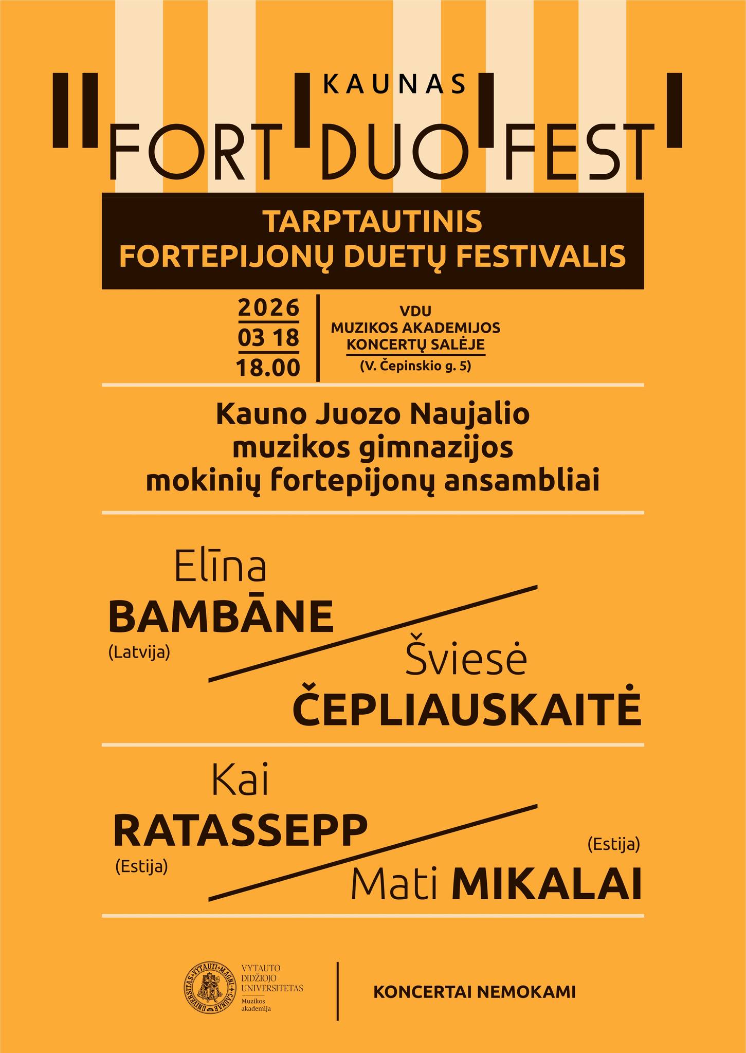 Kviečiame į Ella Elīna Bambane (Latvija, fortepijonas) ir doc. Šviesės Čepliauskaitės (fortepijonas) festivalio „FORT DUO FEST KAUNAS 2026” koncertą kovo 18 d. 18 val. Muzikos akademijos Koncertų salėje