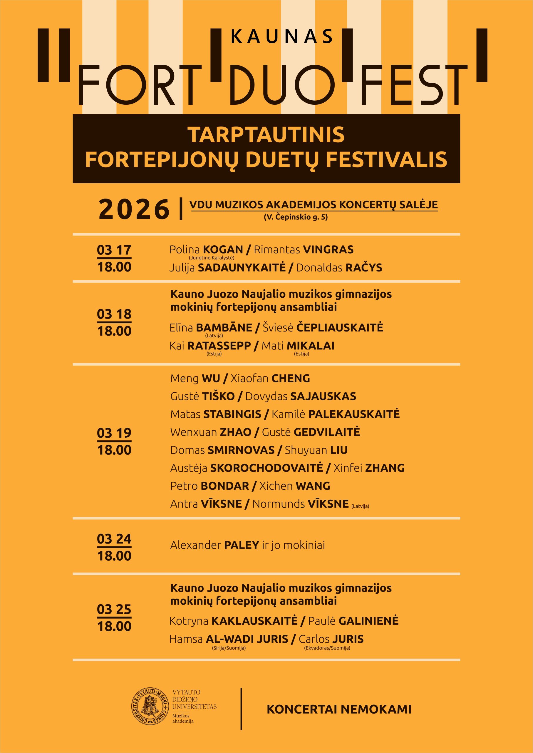 2026 m. kovo 16–17 dienomis Vytauto Didžiojo universiteto Muzikos akademijoje vyks tarptautinis fortepijonų duetų festivalis „Fortduofest Kaunas“. Festivalis suburs jaunuosius ir profesionalius pianistus iš Lietuvos, Estijos, Latvijos ir Suomijos, kurie klausytojams pristatys spalvingą ir menine įvairove pasižymintį fortepijonų dueto žanrą.