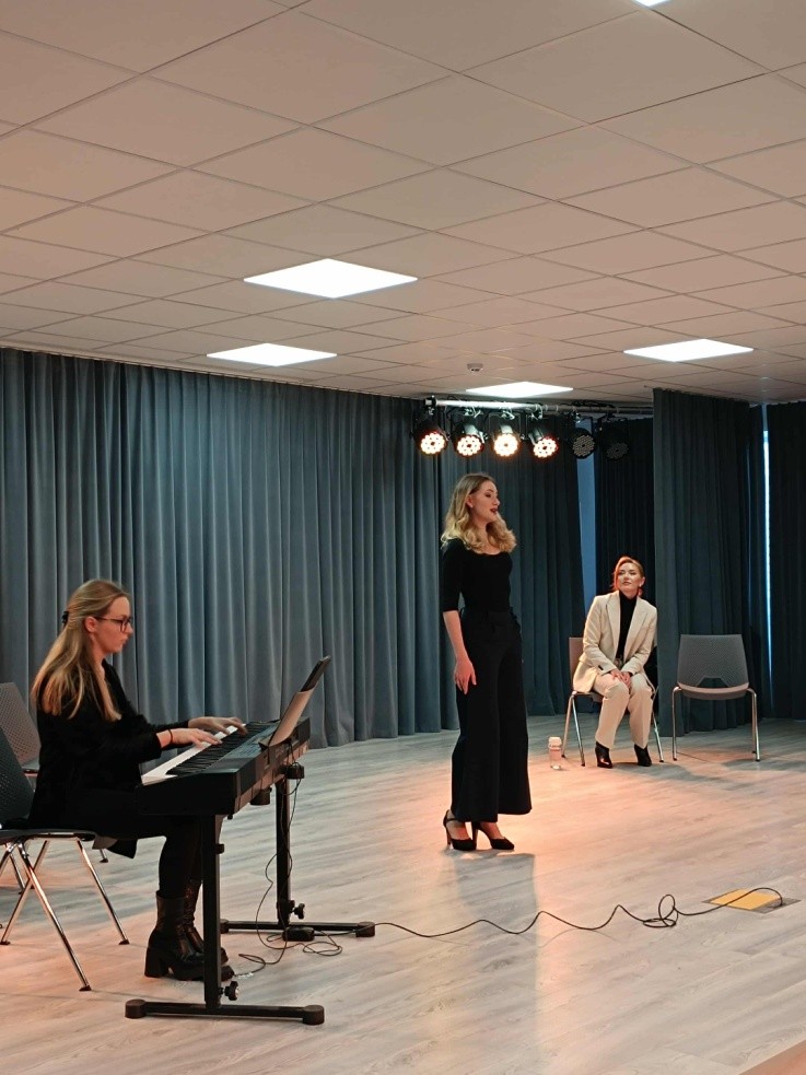 Studentės Emilija ir Deimantė ne tik dalijosi savo patirtimi, bet ir atliko keletą kūrinių, pademonstruodamos skirtingus vokalinius stilius bei interpretacijas.