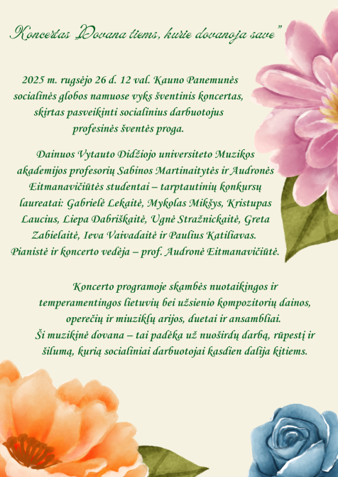 Koncerto programoje skambėjo nuotaikingos ir temperamentingos lietuvių bei užsienio kompozitorių dainos, operečių ir miuziklų arijos, duetai ir ansambliai. Ši muzikinė dovana – tai padėka už nuoširdų darbą, rūpestį ir šilumą, kurią socialiniai darbuotojai kasdien dalija kitiems.