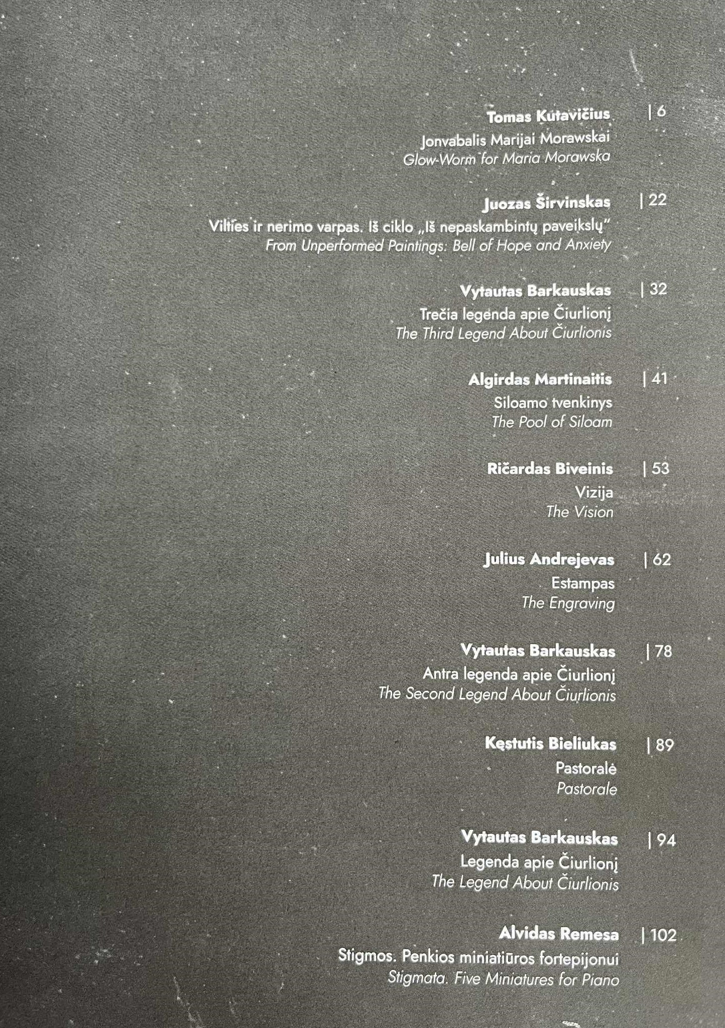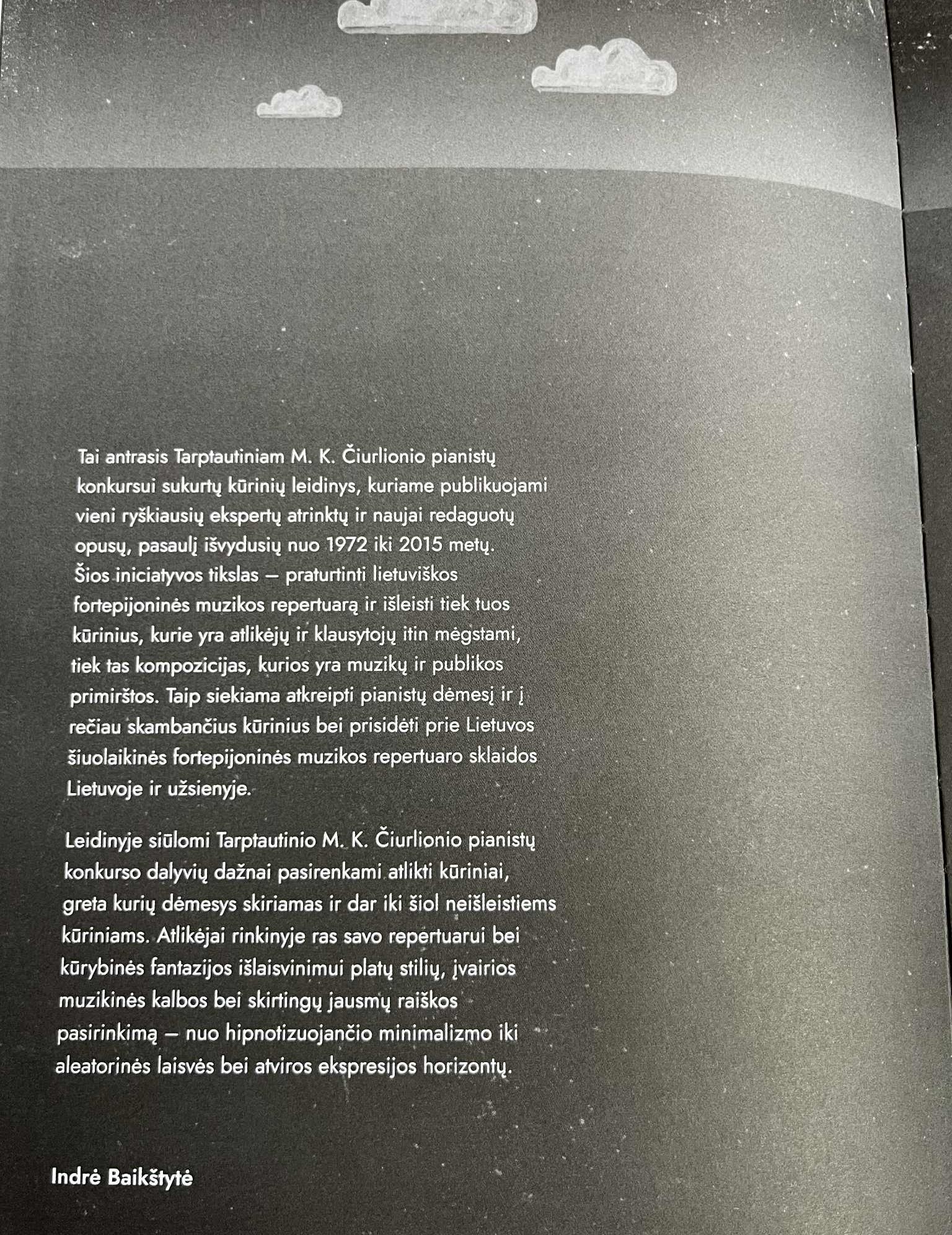 Tai antrasis Tarptautinam M. K. Čiurlionio pianistų konkursui sukurtų kūrinių leidinys, kuriame publikuojami  vieni ryškiausių ekspertų atrinkti ir naujai redaguoti opusai, pasaulį išvydę nuo 1972 iki 2015 metų. Šios iniciatyvos tikslas – praturtinti lietuviškos fortepijoninės muzikos repertuarą ir išleisti tiek tuos kūrinius, kurie yra atliek̃ti ir klausytojų itin mėgstami, tiek tas kompozicijas, kurios yra muzikų ir publikos prisimirštos. Taip siekiama atkreipti pianistų dėmesį į rečiau skambančius kūrinius bei prisidėti prie Lietuvos šiuolaikinės fortepijoninės muzikos repertuaro sklaidos Lietuvoje ir užsienyje. Leidinyje solomi Tarptautinio M. K. Čiurlionio pianistų konkursas dalyvių dažnai pasiekiami atlikti kūriniai, greta kurių dėmesys skiriamas ir dar iki šiol neįleistiems kūriniams. Atlikejjai rinkosi ne savo repertuarui bei kūrybines fantazijas išlaisvinimų platų stilių, įvairios muzikinės kalbos – atsižvelgiant į sąmoningą raiškos  pasirinkimą – nuo hipnotizuojančio minimalizmo iki aleatorinės laisvės bei atviros ekspresijos horizonto. (tekstas: Indrė Baikštytė)