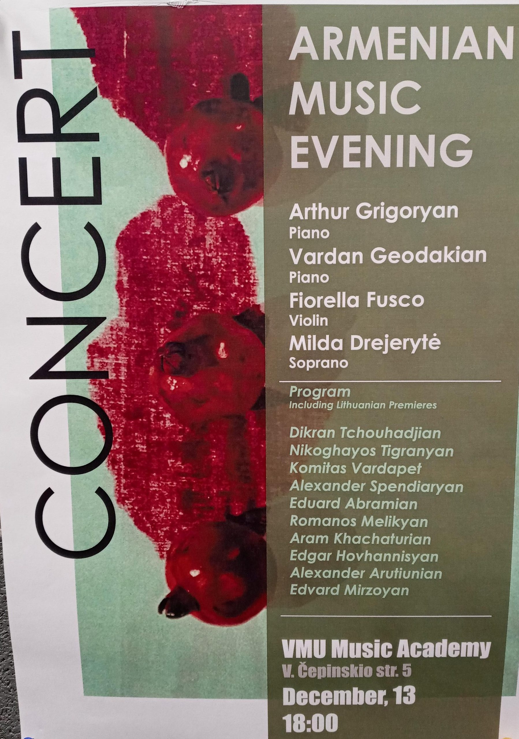 Kviečiame į armėniškos muzikos vakarą Muzikos akademijoje, gruodžio 13 d. 18 val. koncertų salėje: Arthur Grigoryan (fortepijonas), Vardan Geodakian (fortepijonas), Fiorella Fusco (smuikas), Milda Drejerytė (sopranas)