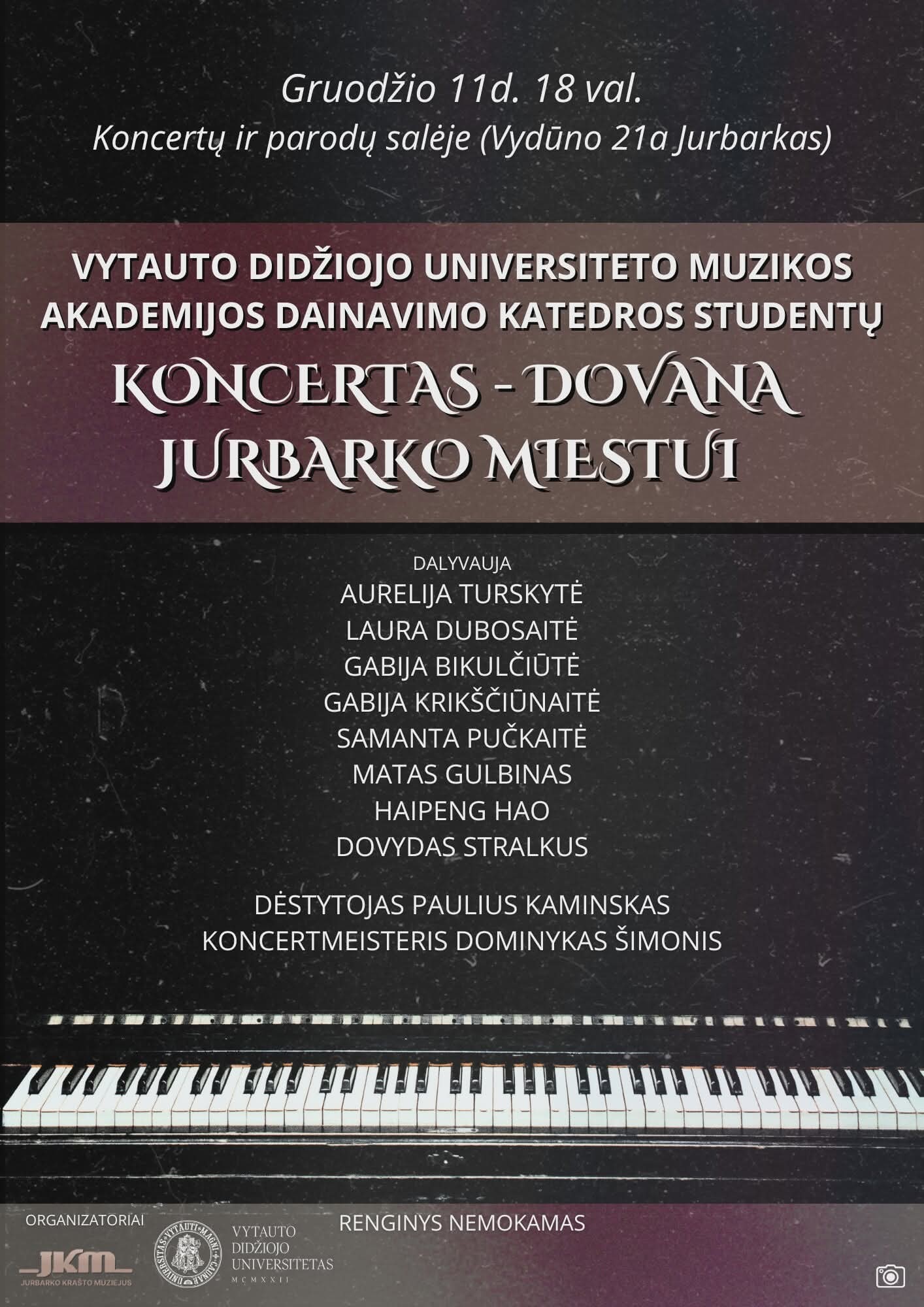 Kviečiame į VDU Muzikos akademijos Dainavimo katedros skyriaus studentų koncertą-dovaną Jurbarko miestui, gruodžio 11 d. 18 val. Koncertų ir parodų salėje (Vydūno 21a Jurbarkas)