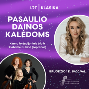 Pasaulis kupinas dainų – populiarių ir primirštų, uždegančių energiją, kviečiančių šokti ar apgaubiančių ramybės atmosfera. Kauno fortepijoninis trio kartu su soliste Gabriele Bukine pristatė programą „Pasaulio dainos Kalėdoms“ – muzikinę kelionę po išorinį ir vidinį pasaulį, akimirką sustoti, apmąstyti besibaigiančius metus, prisiminti seniai girdėtą melodiją ar atrasti naują, lydėsiančią stebuklingą metų virsmą. Kiekviena daina – net ir be žodžių – pasakoja savo istoriją, o kiekviena išgirsta istorija tampa mūsų patirties dalimi. Simboliška, kad koncertas prasidėjo ir baigėsi dainomis apie muziką – tarp jų slypi nuotaikų ir emocijų įvairovė. Koncertas „Pasaulio dainos“ praturtino mūsų Kalėdų laukimą.