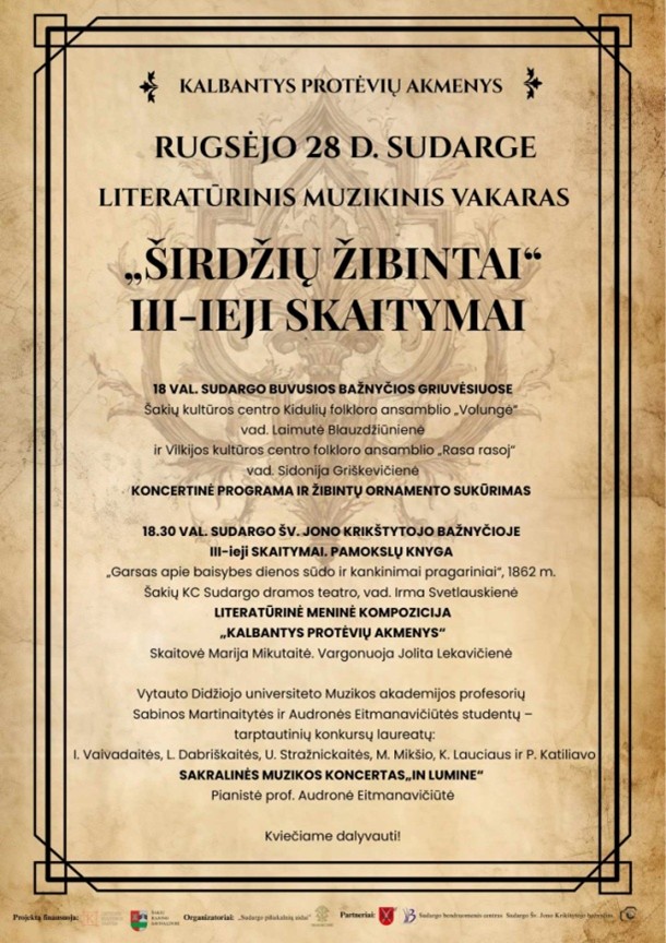 Renginys „Širdžių žibintai“ – tai ne tik literatūros skaitymai, bet ir gyvas liudijimas apie spaudos draudimo laikotarpio kovą už lietuvišką žodį. Sudargas, būdamas pasienio miesteliu, buvo svarbi grandis knygnešių kelyje, o tokie renginiai primena, kad kultūrinė rezistencija vyko ne tik didmiesčiuose, bet ir mažuose kaimuose, kur kiekvienas lietuviškas žodis buvo tarsi širdies žibintas tamsoje.