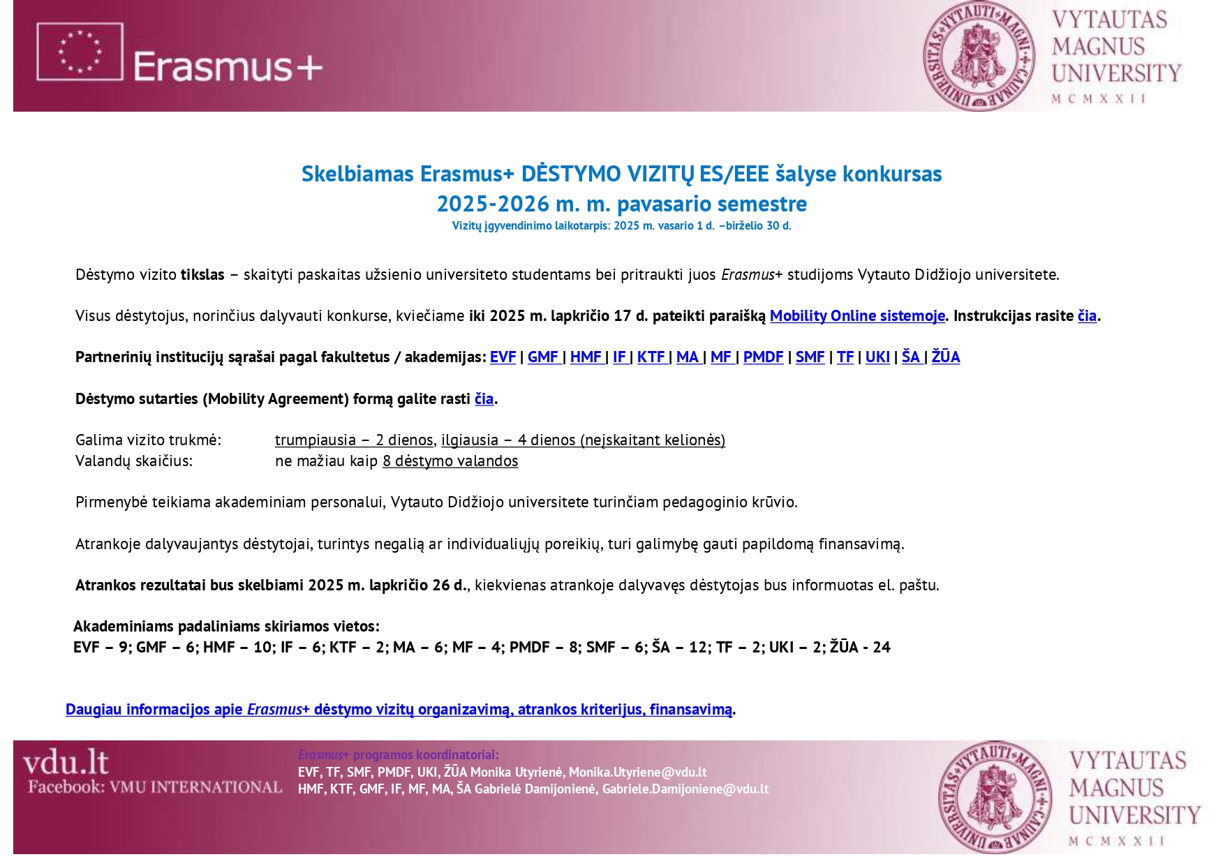 Skelbimą ir Erasmus+ dėstymo vizito sutartį (prašome naudoti naujausią sutarties formą, nes užpildžius senesnes versijas vėliau turime nurodyti dėstytojams sutartį užpildyti iš naujo) pridedame prisegtuke.